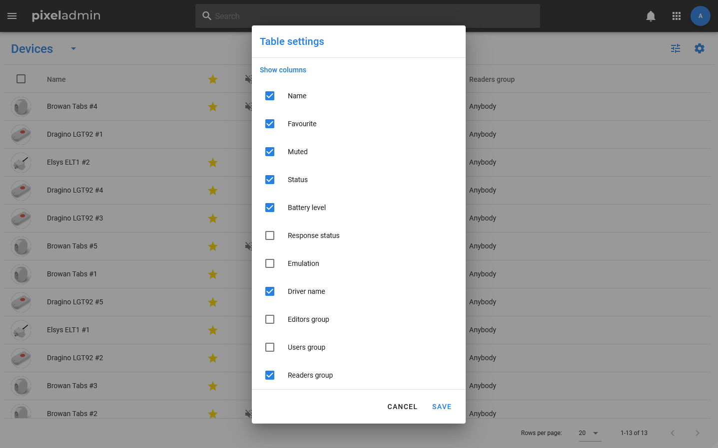 Each table includes several mandatory and optional columns. Each user can enable and disable optional columns without affecting the work of other users. The table settings window is called when you click on the Settings icon in its toolbar.