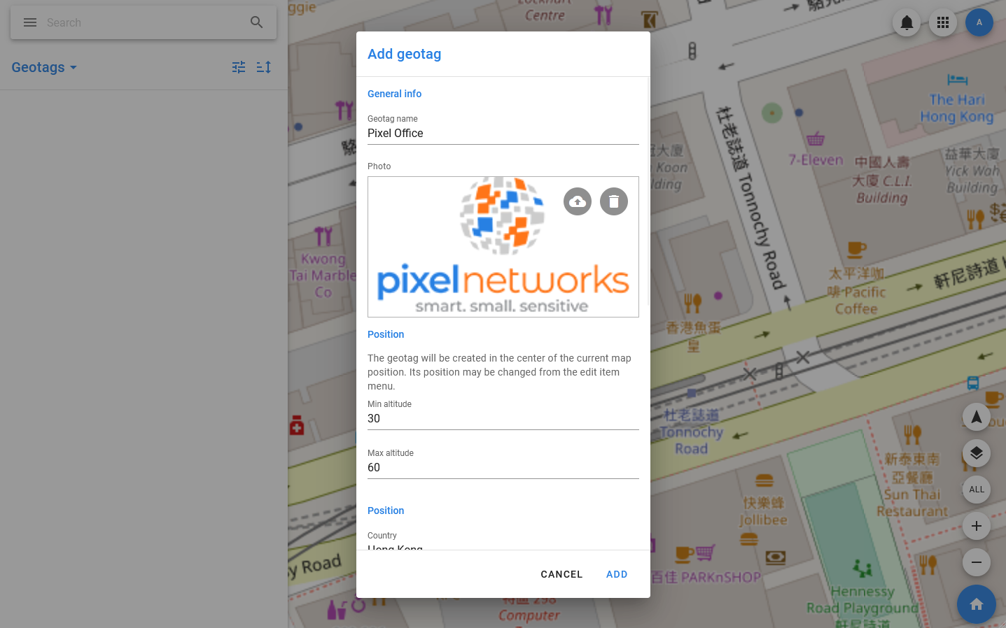 - In the modal window that opens, specify the name of the geotag, its height, address, image.