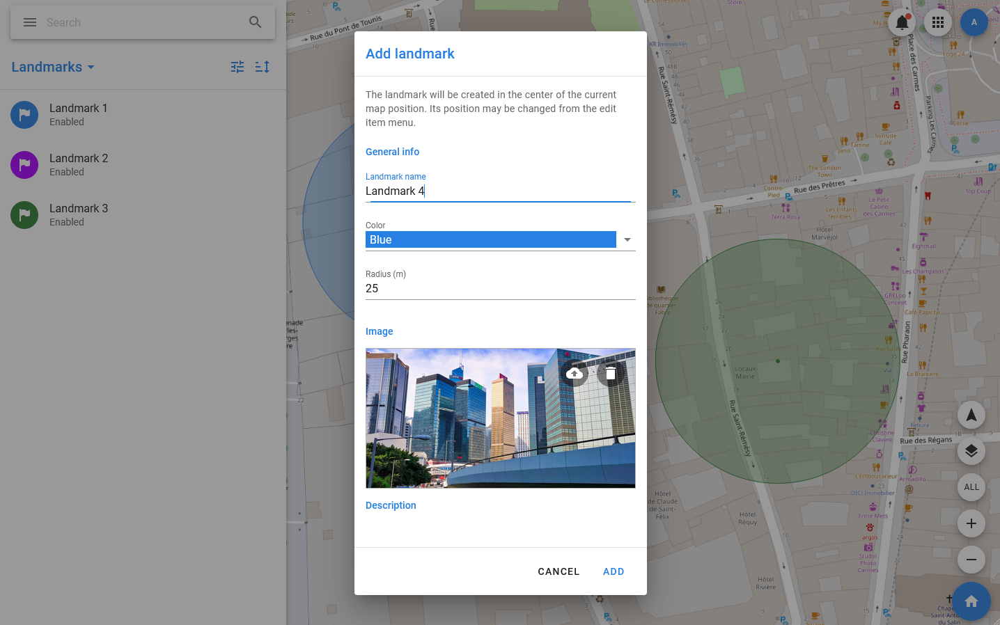 - In the window that opens, specify the name and radius of the landmark, select its color and main geotag.