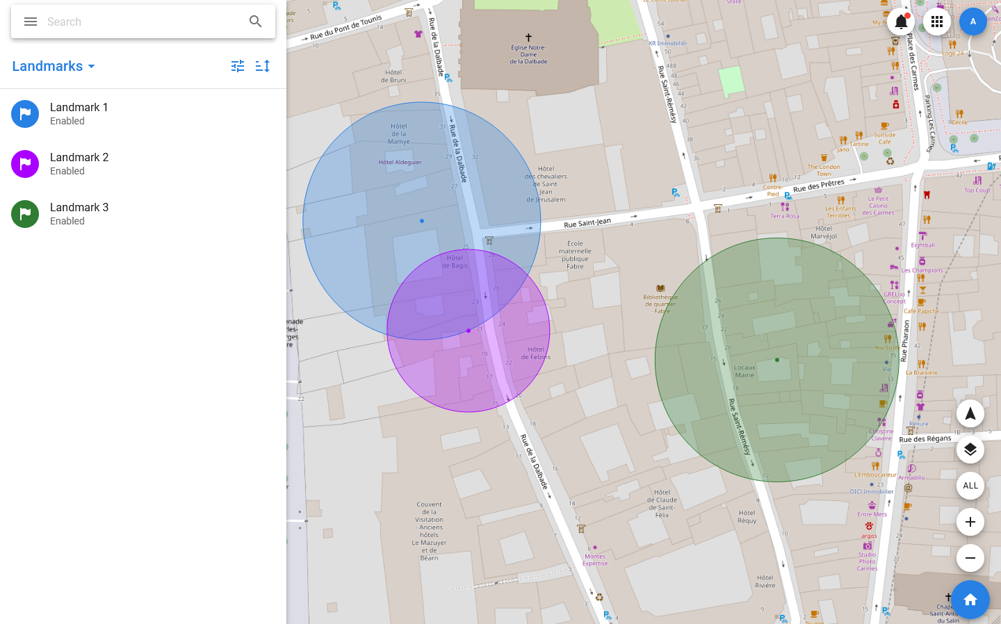 A complete list of all the landmarks is opened when you select the same item in the menu. At the same time, the landmarks are also displayed on the map as circles of their assigned colors. The list displays the avatar of the landmark, whose color also corresponds to the assigned color, name, status, and area. Also, the status bar contains icons corresponding to disabled notifications and favorites.